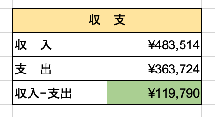 収入 483,514円 ー 支出 363,724円 = +119,790円